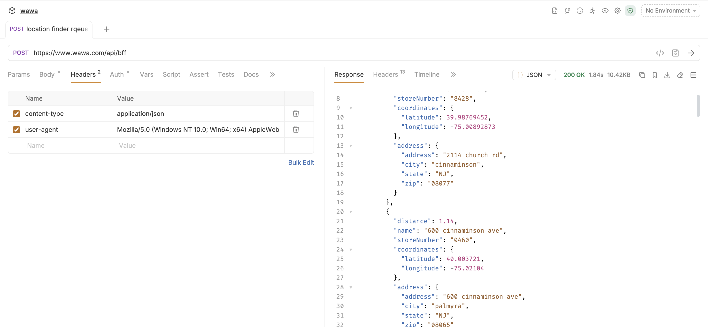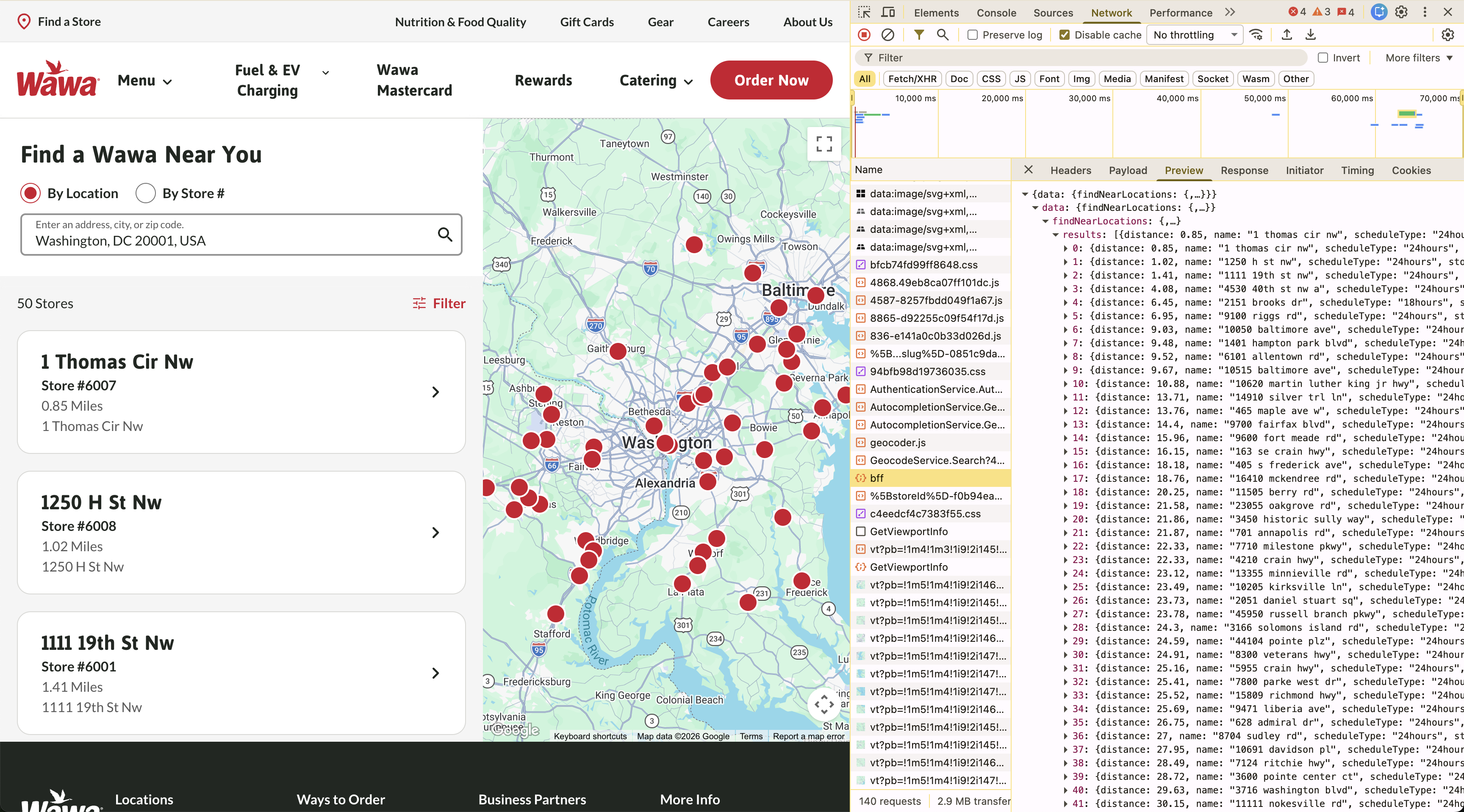 When we navigate to the Wawa website, we see that there is a "Find a Wawa Near You" tool. Opening up the dev tools panel, there's a graphql endpoint that returns the 50 closest wawas given a latitude and longitude.